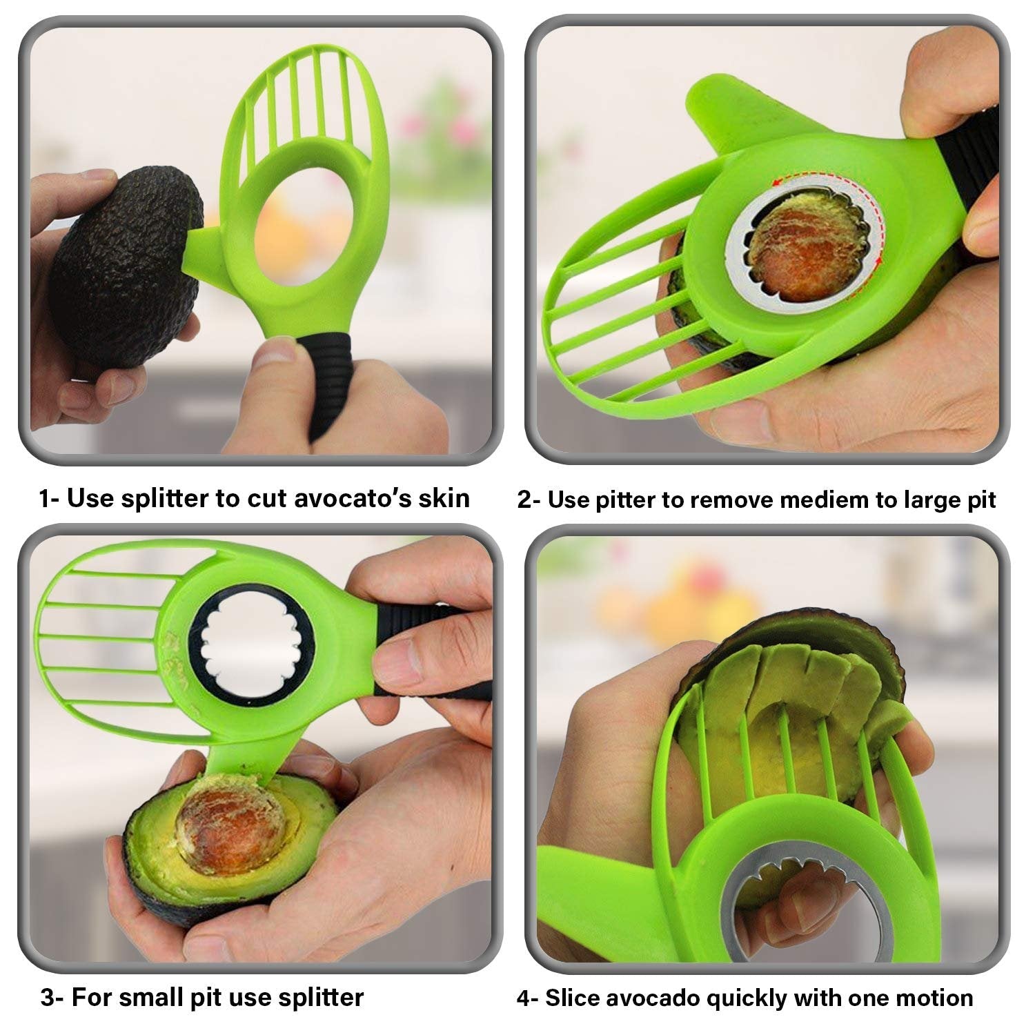 Avocado snijden: Roestvrijstalen ontpitter verwijdert de pit met één snelle draai, het is echt vrij scherp maar niet zoals een roestvrijstalen mes om je vinger te bezeren. De snijder verwijdert het fruit van de schil in perfect gelijke plakjes, je zult nooit meer iets van de avocado verspillen. Verwijdert de avocadokern met een veilige en licht draaiende beweging. Gemakkelijk schoon te maken en veilig te gebruiken in de vaatwasser.