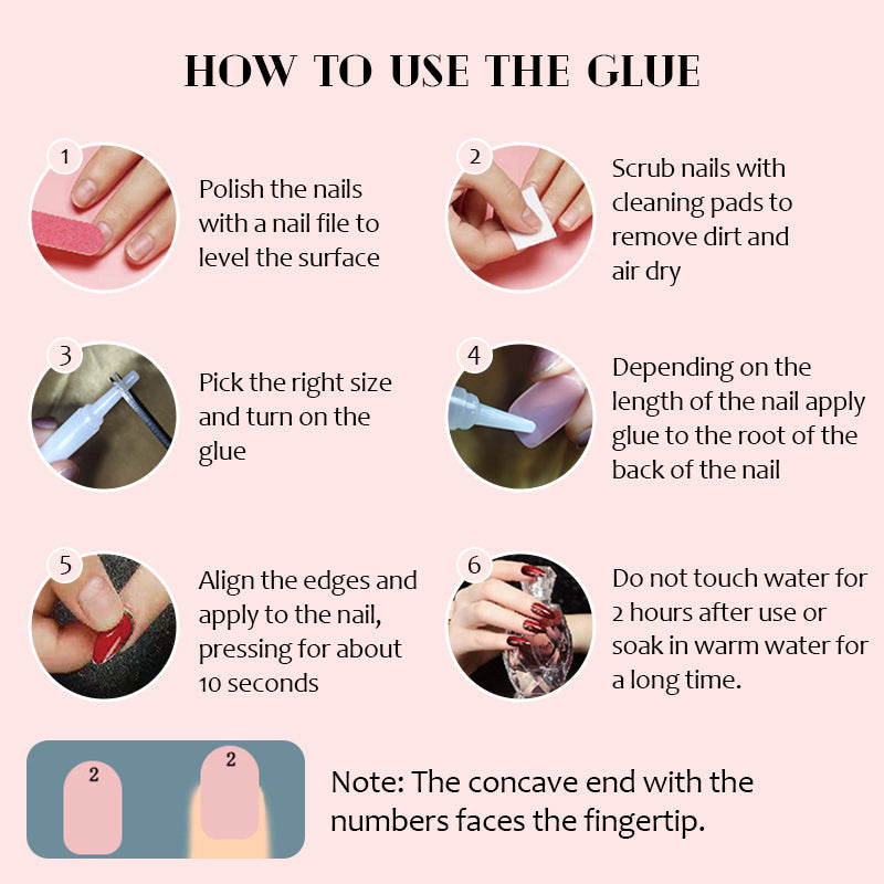 Met deze nagels is een perfecte manicure nog nooit zo makkelijk geweest. Maak gewoon je natuurlijke nagels schoon, kies de perfecte maat uit ons aanbod, breng de lijm gelijkmatig aan, druk aan en voila! Je nagels zien er natuurlijk en prachtig uit zonder moeite.