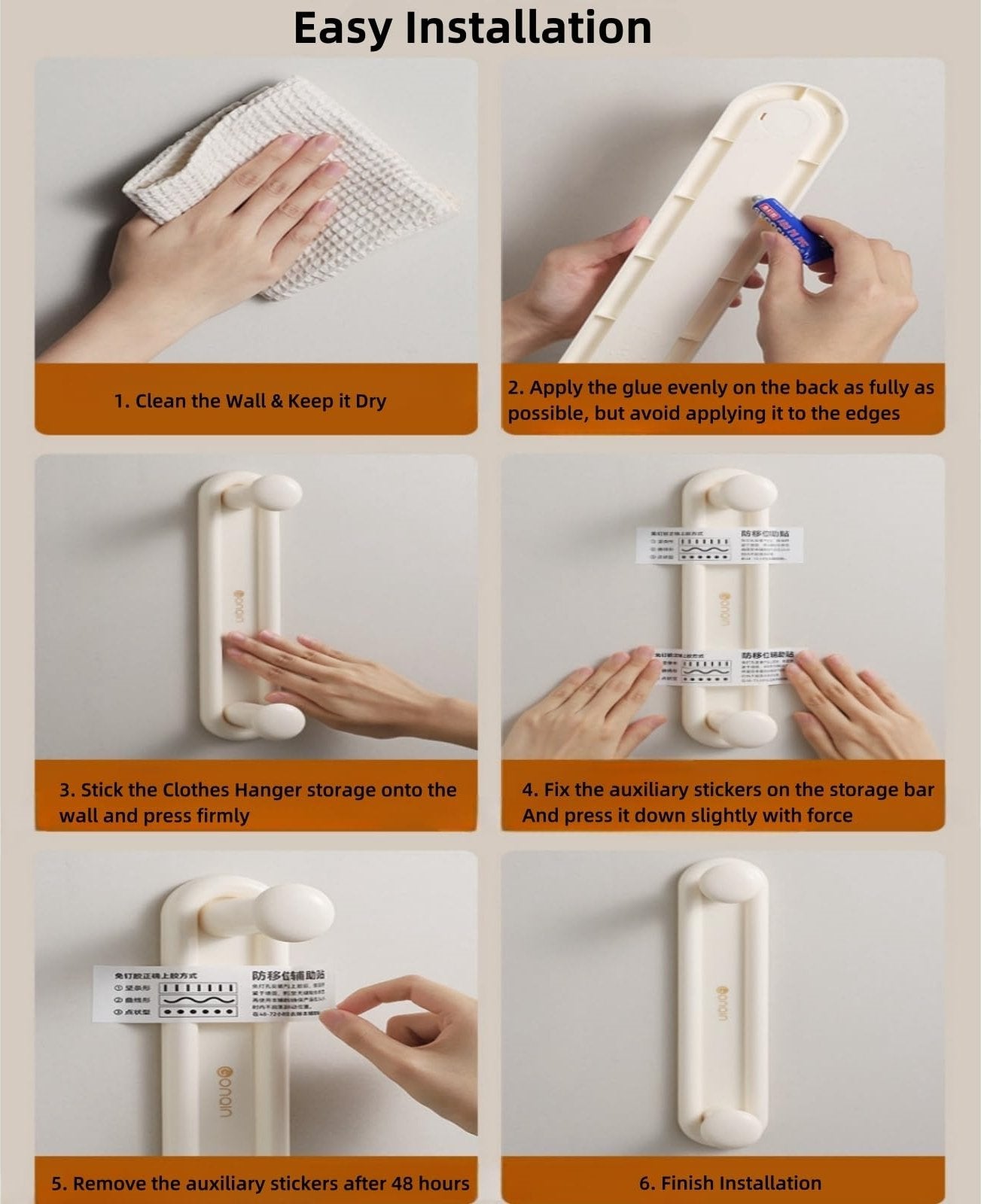 Eenvoudige installatie: het is eenvoudig in een paar stappen te installeren. 1. Maak de muur schoon en Houd het droog. 2. Breng de lijm zo volledig mogelijk gelijkmatig aan op de achterkant, maar vermijd het aanbrengen op de randen. 3. Plak de kledinghangeropberger op de muur en druk stevig aan. 4. Bevestig de extra stickers op de opbergbalk en druk deze lichtjes aan. 5. Verwijder de hulpstickers na 48 uur. 6. Voltooi de installatie.