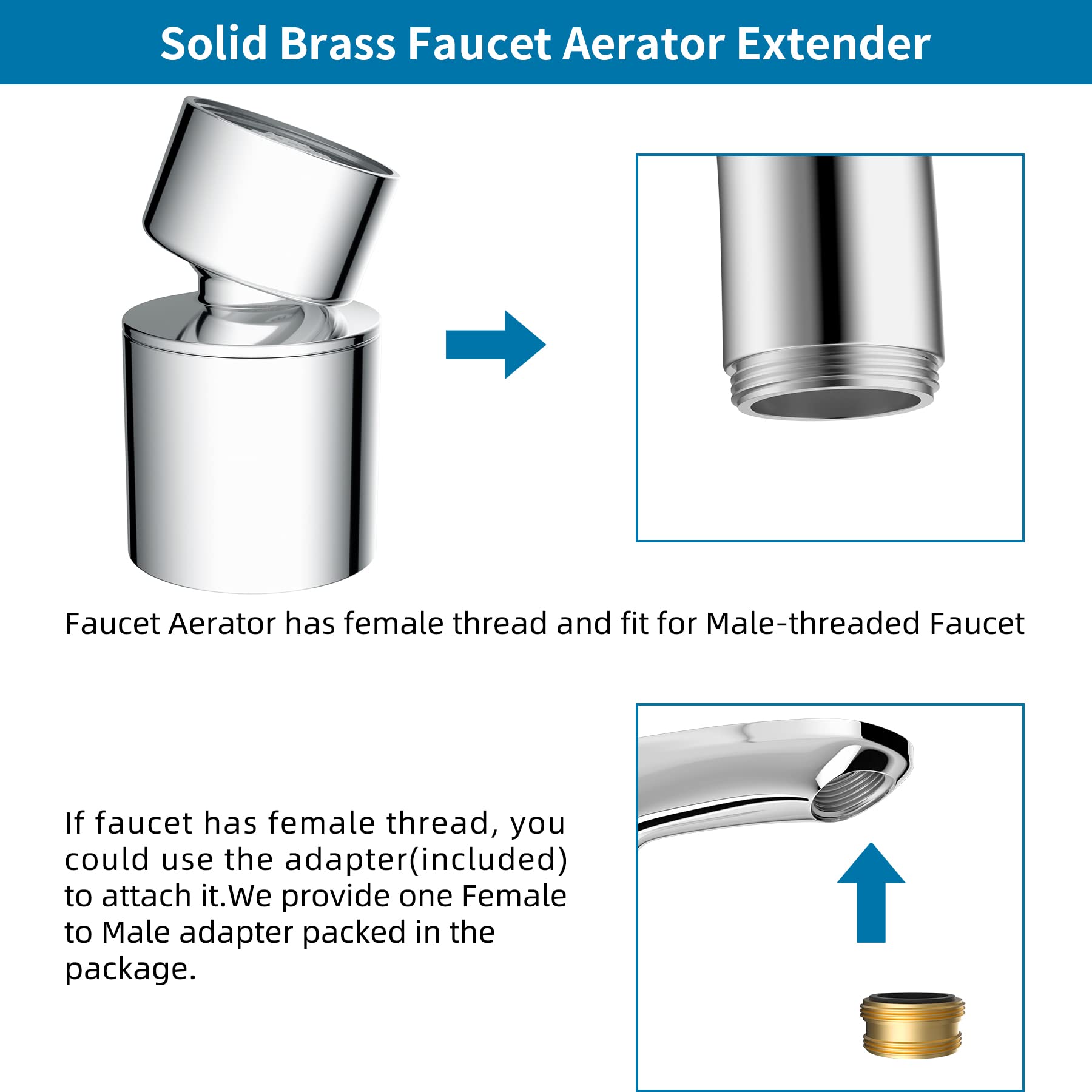 Gemakkelijk te installeren: De keukenkraanbeluchterverlenger heeft een interne draad die geschikt is voor kranen met mannelijke draad. Als uw kraandraad een vrouwelijke draad is, kunt u een adapter kiezen die hierbij past. Wij leveren u een vrouwelijke naar mannelijke adapter die bij het pakket is inbegrepen.