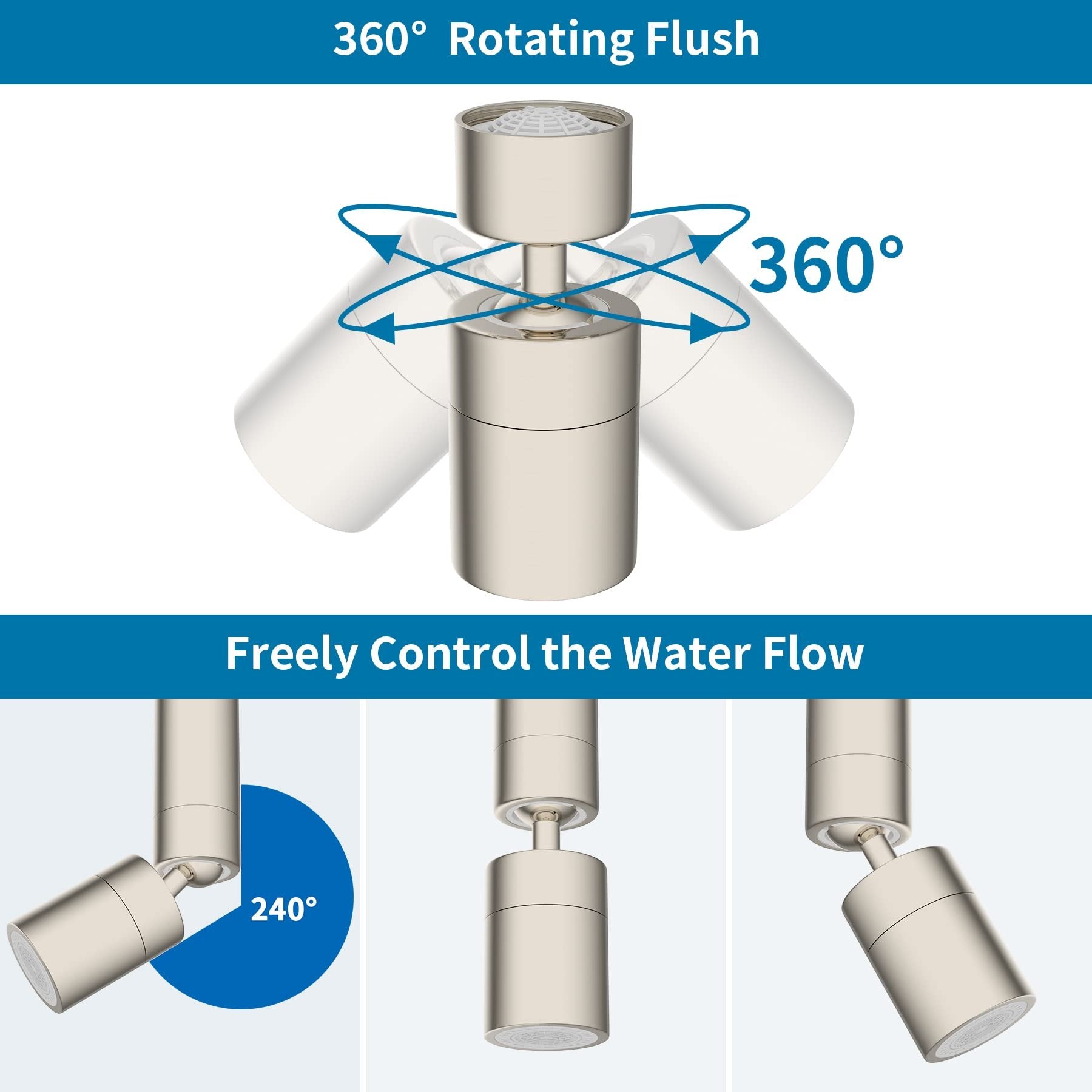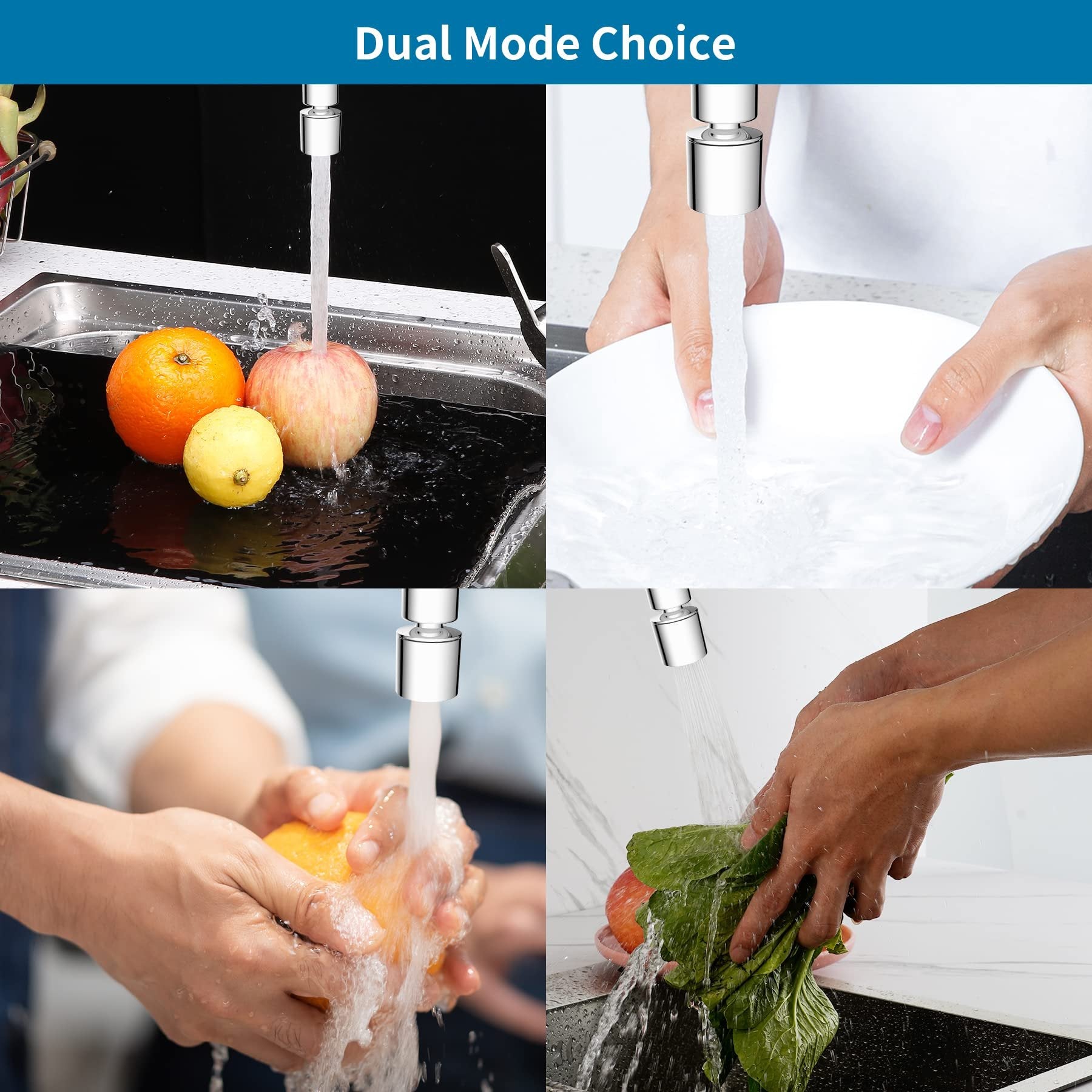Dubbele functie 2-stralen sproeier: De beluchter voor de keukenkraan is 100% lekvrij en de roterende onderkant kan de zachte bubbelstroom omzetten in een krachtige straal met een rotatie van 360 graden.