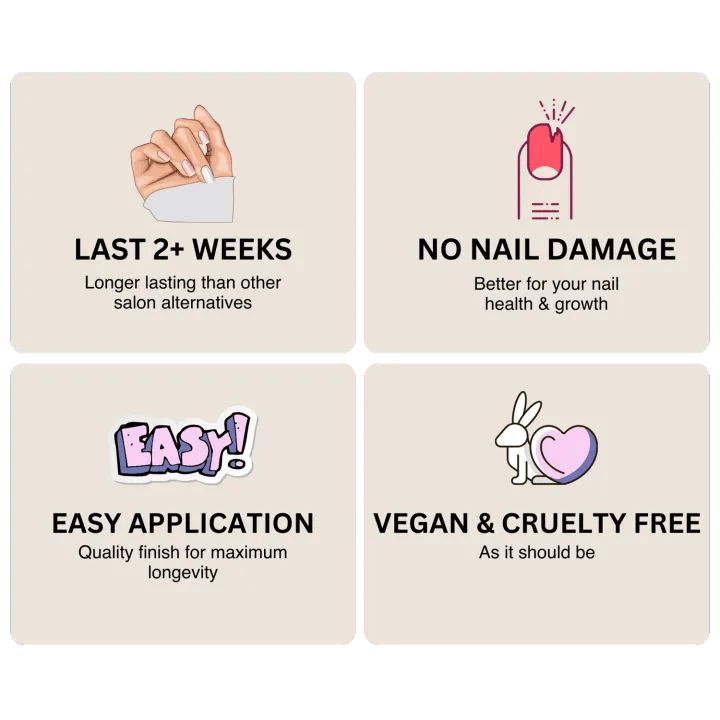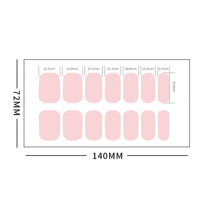 De semi-uithardende nagelstrip bestaat uit meerdere lagen, waaronder toplaag, gellak en kleefbasis. Hierdoor biedt het een gelachtige zachte glans en volume en blijft het langer zitten.